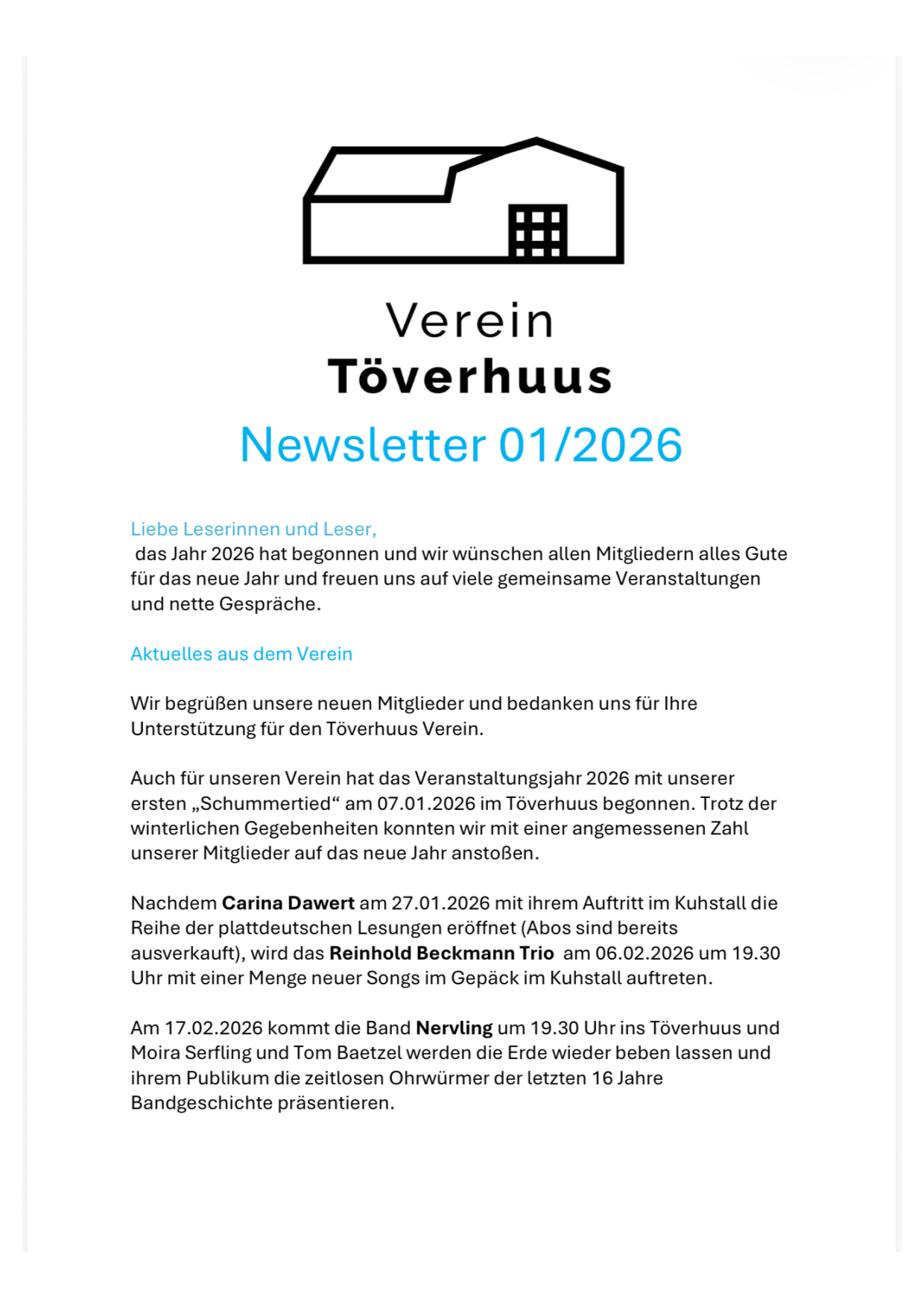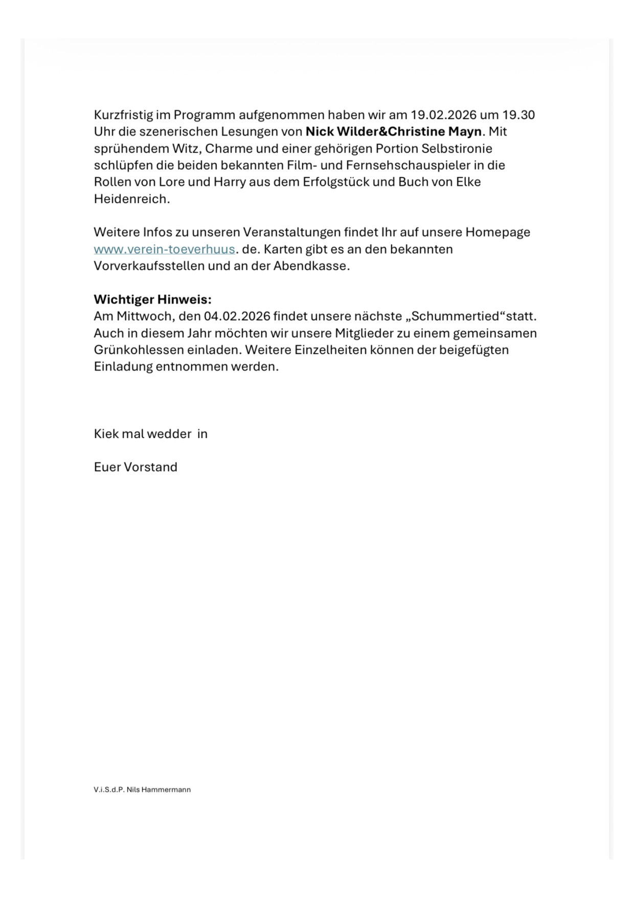 Newsletter 01/2026 12. Jan. Verfasst von Holger Burmeister Liebe Mitglieder,anbei übersenden wir unseren aktuellen Newsletter und die Einladung zum Grünkohl Essen.Liebe GrüßeEuer Vorstand Holger Burmeister